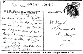 The Edwardian card, dated 30 July 1907, is a message from a young girl sent to her aunt in Tooting, South London. It has a photograph of a class of schoolchildren on the front, possibly featuring the author herself.